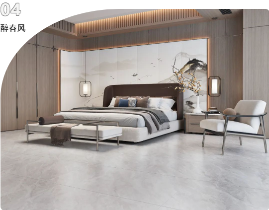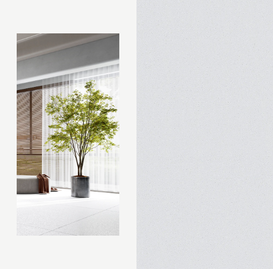 地面選用750x1500mm黃金規格的浪淘沙進行通鋪,簡潔的線條設計與不同材質交匯融合。不僅讓空間更具擴張力和延展力,清新淡雅的綠植作為點綴,猶如置身大自然,仿佛呼吸中亦有抵達心底的治愈。
