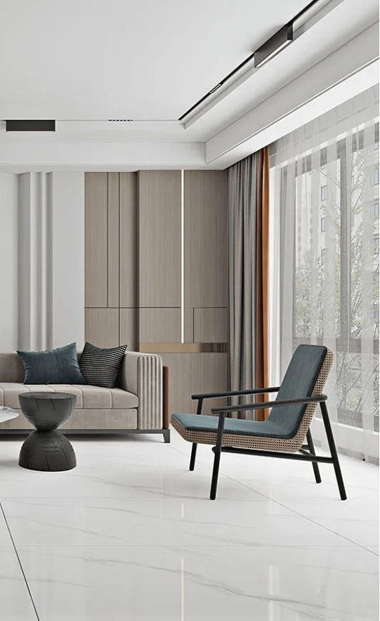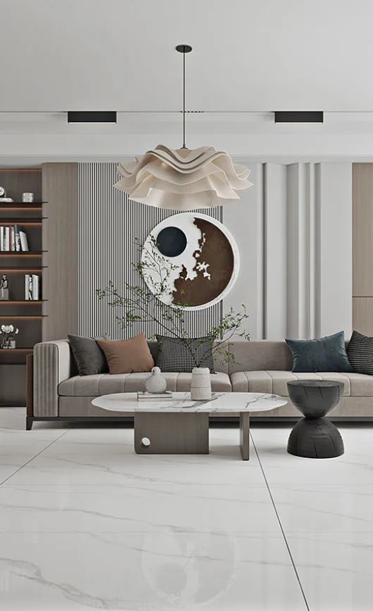客廳采用無(wú)限連紋哈爾施灰作為地面通鋪